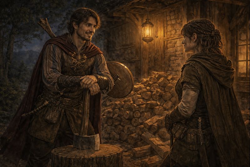 Arriving at the inn, Ronan and Sylvia are surprised to see a flamboyantly dressed man sawing at a log near the woodpile. Ronan glances at his companion, who simply shrugs her shoulders before leaping over the fence to approach the man.