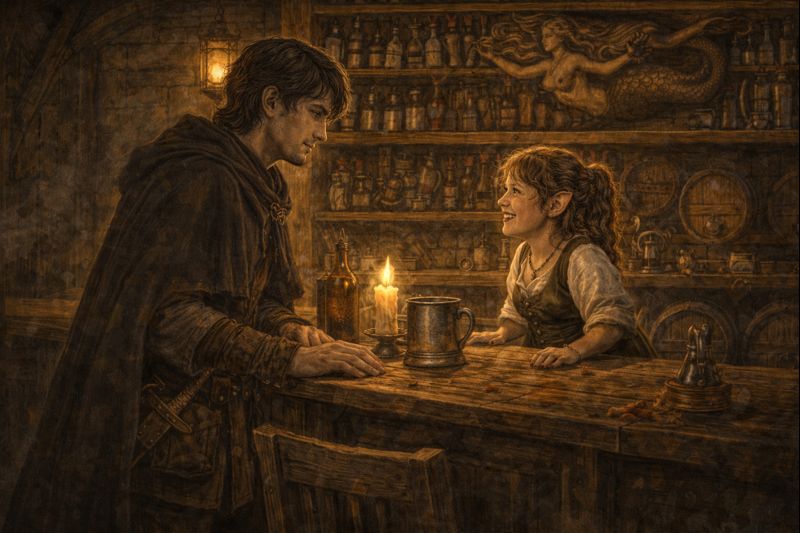 Edwin makes his way to the bar, and finds it tended by a halfling woman standing atop a chair. “Hi there, Slim,” smirks the halfling, looking him up and down. “Just the kind of man I was hoping to see tonight!”