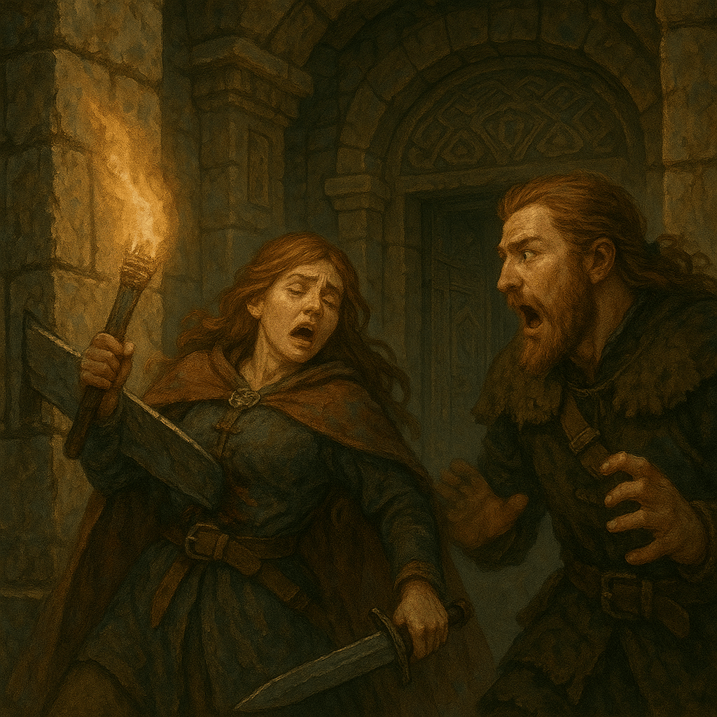I look beyond, and see more crates in the next room and a heavy door to the left. I wait by Njora’s side, shield and axe by my side, soothing the woman.