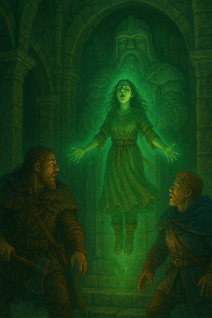 We step into the emerald glow of the ancient temply. Ahead, a great statue stands of a dwarven warrior with hammer upraised. On the far walls stand two other statues, holding great bells that ring ceaselessly. Great braziers lit with a green flame shine forth where ancient worshippers once offered forgotten prayers. Suddenly, the light engulfs Njora, her eyes roll back, and she begins speaking in a strange tongue.