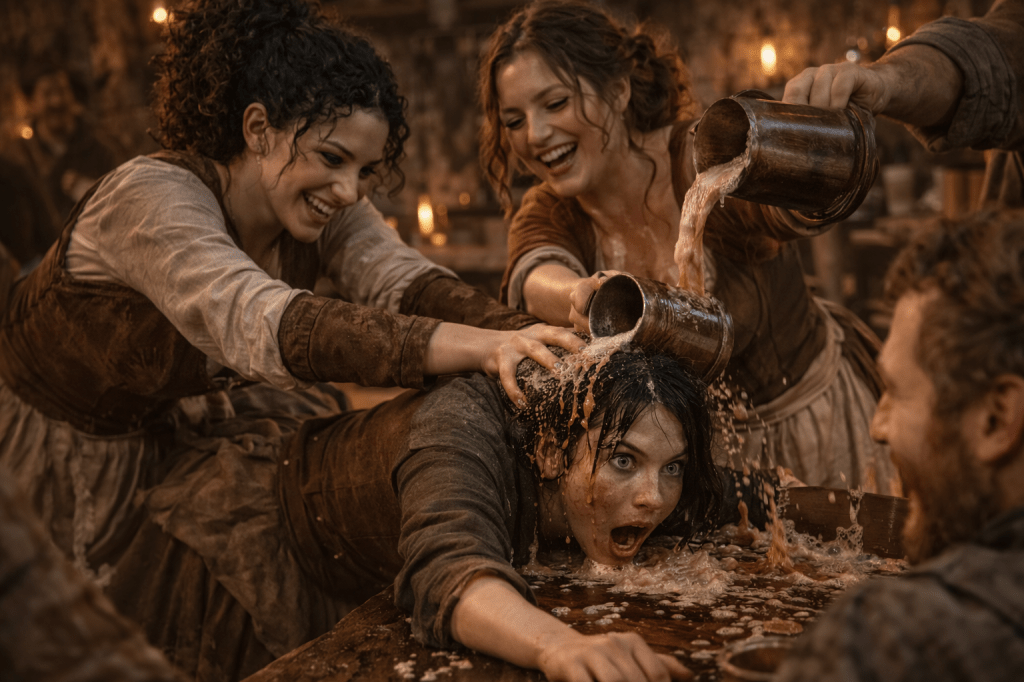 Inside, guests are telling stories, drinking ale and Casia nods for me to go upstairs and get changed while Mini is more vocal, “Talia! We need another set of hands.”