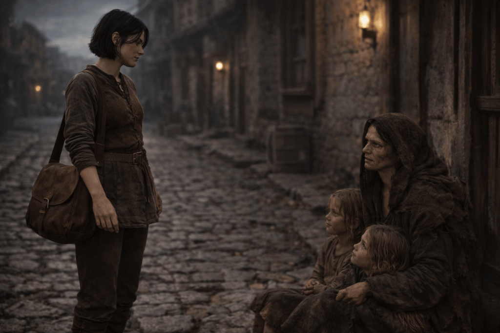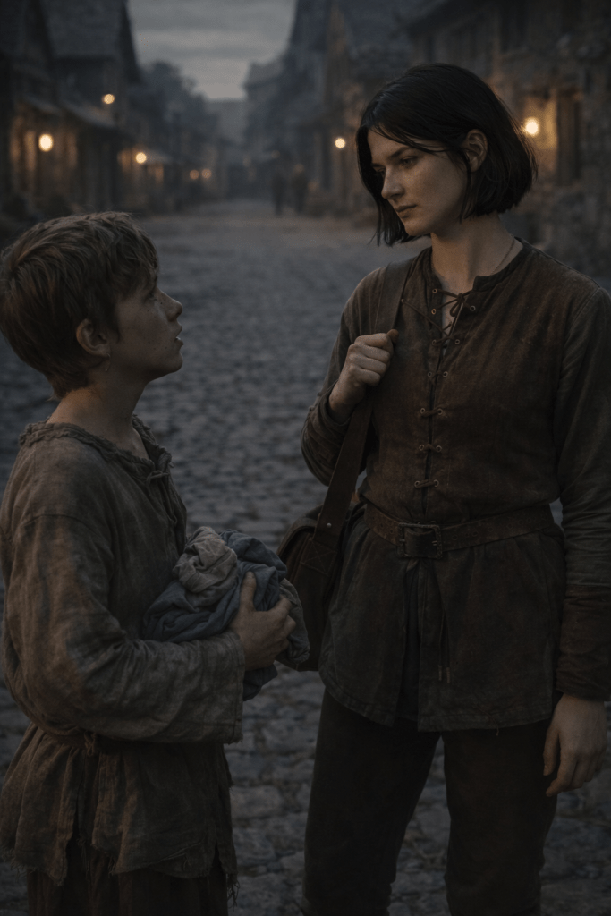 He looks up at me, “Can you use a servant? I can mop floors. Clean stables. Carry heavy things. Anything! I just…need some bread…and…” he swallows,”…someplace warm to sleep.” he whimpers.
