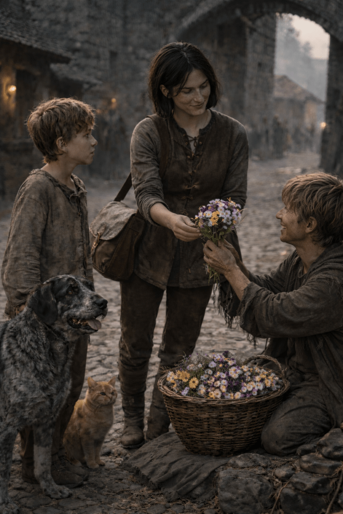 “Flowers! Fresh flowers mum!” calls out the ragged looking boy from a few days ago in the tavern.