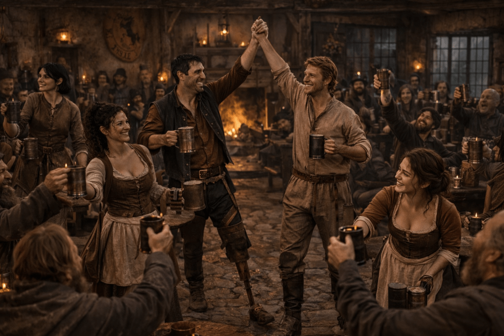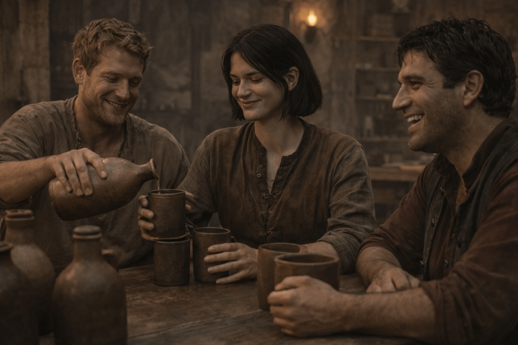 “This is the greatest ale in Oldenstone!” one man declares, patting Dorak on the shoulder.