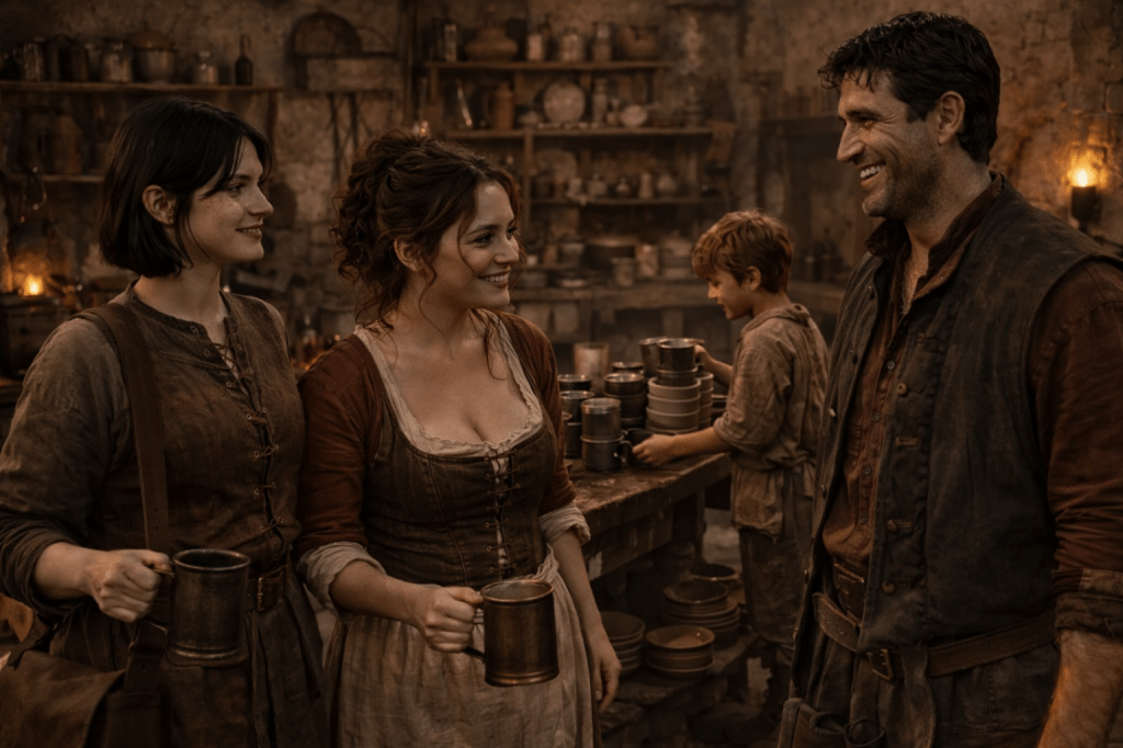 “Drink more, talk less,” I suggest bringing the men another round, “Then drink more again!” I wink before working my way back to the kitchen with empty cups for Pelop to wash. I smile when I see how hard he is working to keep up with the flow of cups, bowls and spoons. “Good lad.” I nod at him, “Pelop, was it? I’m Talia. The curly haired woman is my sister, Casia. The other, that’s Mini.” I nod towards the other alewives. He looks at them, and smiles up at me, then gets back to work. “I’ll see if you can sleep here in the kitchen after we clean up. Then I think I know someone who could use a good set of hands, tomorrow.” He nods gratefully.