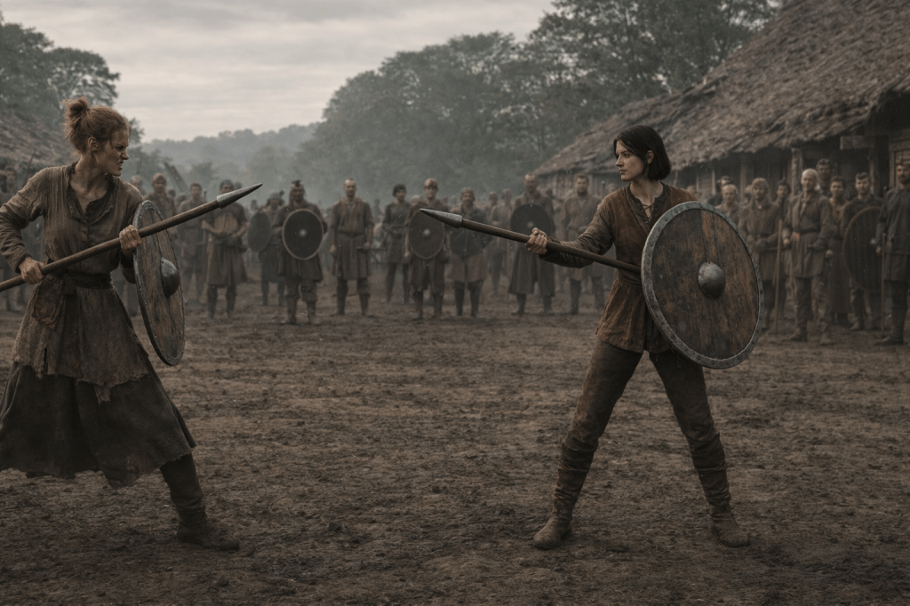 Halfway through the drill, we begin actual combat training, matched off in opposed pairs. I find myself opposite a skinny looking farm girl several years older than me. She looks me up and down, “Bring it, bitch”