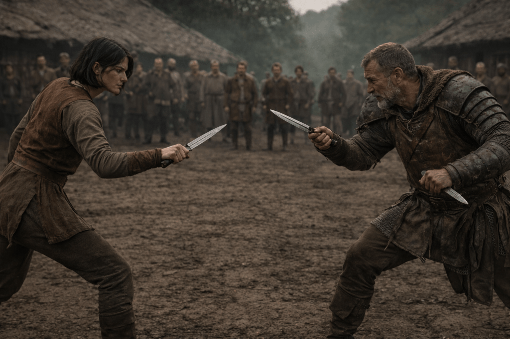 The sergeant looks between us, then tosses the dagger back to me, “Show me!” he draws his. We go back and forth for nearly a minute, each seeking an opening. He can’t get at me, but I can’t get at any part of him unprotected by mail. But ultimately, he slips past my guard and gets his blade up against my gut. Then he pushes me away. “Where’d you learn to use a blade but not a spear?”