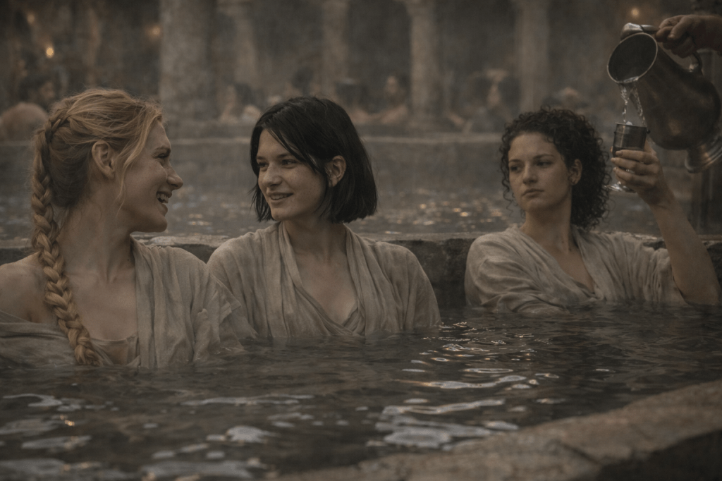 Q: Does anyone approach us at the baths? No Q: Do we see anyone we know at the baths? Very Unlikely-No (The cast of women they know in town who are wealthy enough to afford the baths, but low enough in rank to use a public one is basically…two people) Q: Are her professional contacts with her? No