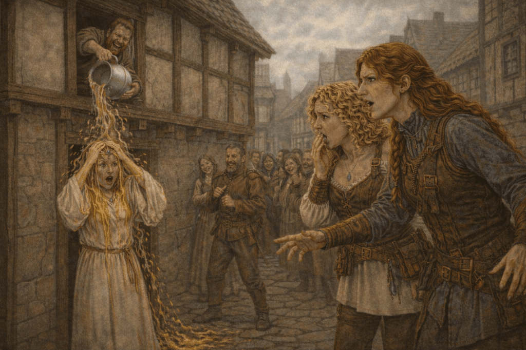 I chastise the man hanging out from the window above, with chamber pot in hand, “Have you no shame! Head to the temple and do penance, lest your insult to Freia be held against you in judgement!”