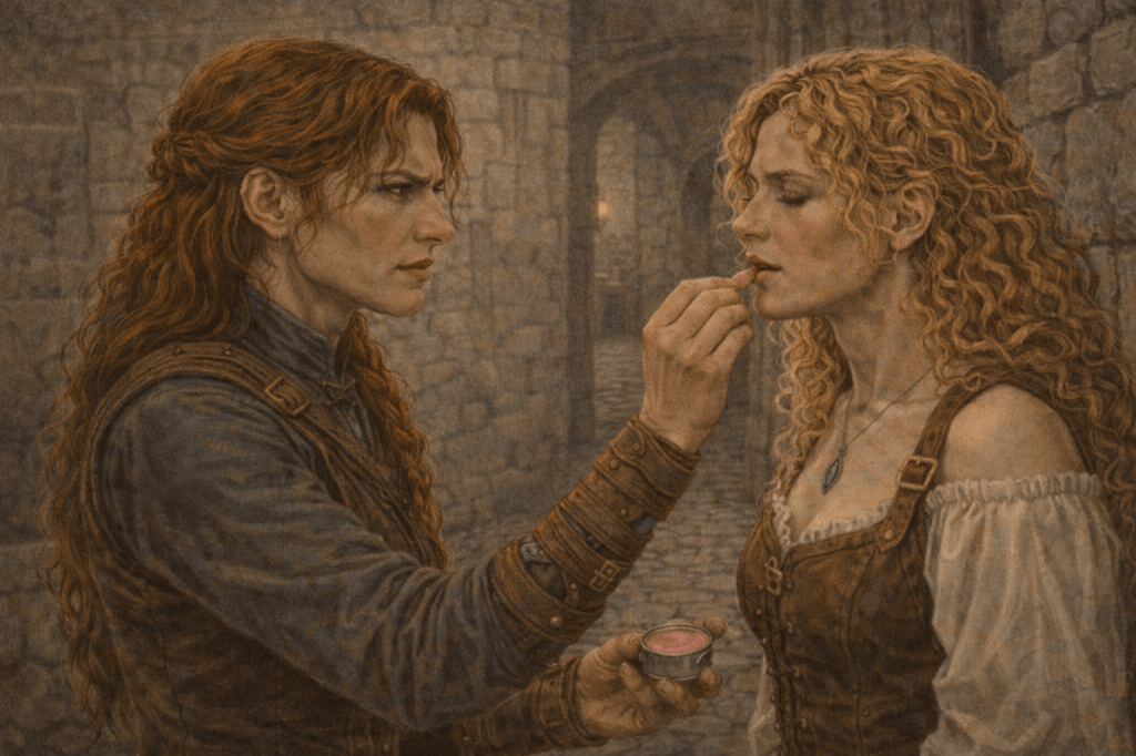 “Let me do you now,” she suggests, and I stand still for her to paint my face as well, “Now it won’t seem odd that the servant wears makeup but her lady does not!”