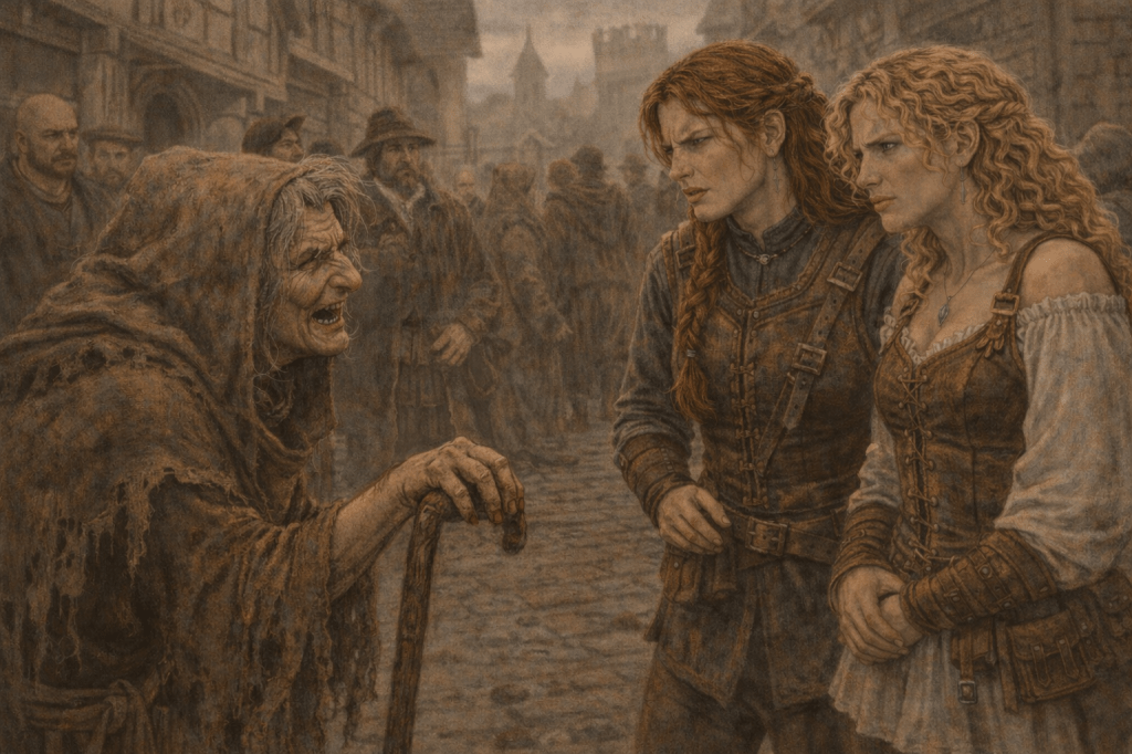 Having drawn out two more pouches of coin from the treasury, Eveline and I are walking through town towards the Devil’s Cup when we first hear her, “Abandon greed! Share your wealth! Tend to those less fortunate than yourselves! It is through compassion and sacrifice that we prove our devotion and forestall judgement!” Then there is a loud splash, and laughter, as the young prophetess is doused by a chamber pot, her white robes now stained and yellow, clinging to her as she gasps in horror.