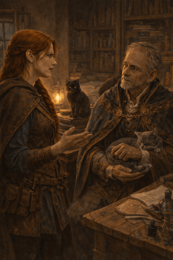 Father continues, “Apparently, someone arranged the Loreseekers to watch over him, and the attack was thwarted. Who might have done such a thing, I wonder?” his eyes bore into mine.