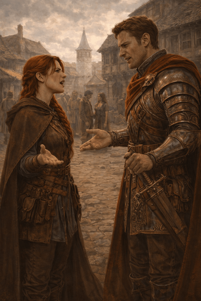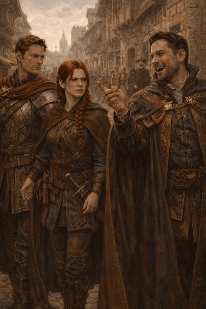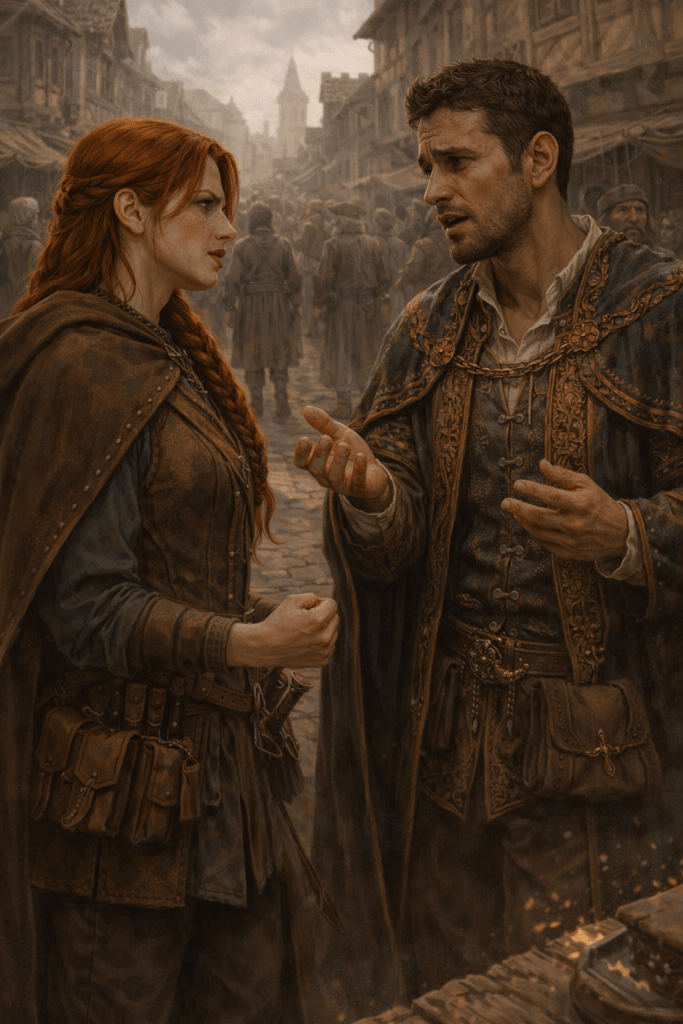 “A dandy little fop with a sword should mind his own place,” the guild master retorts. “It’s money makes the world go round, and that nag you’re riding is more fit for a butcher than a battle.”