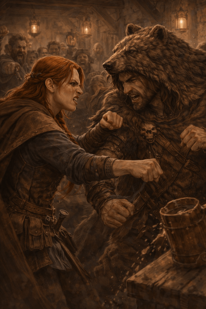 I glare at him, but don’t protest, as I have faith in Karta. My faith is quickly justified as the half orc surges at her foe and slips two blows past his shield in quick succession. Then the two fall into a rhythm of attack, parry, probing and testing. Karta lands a third hit, then suffers a light blow across the arm, then a hard strike to her helm that clearly dazes he for a moment. Then as Oswyn comes in for the kill, Karta lashes out, bashing his blade aside with a hard strike to his gauntlet then a thrust to the chest that would have been lethal had the fight used real weapons.