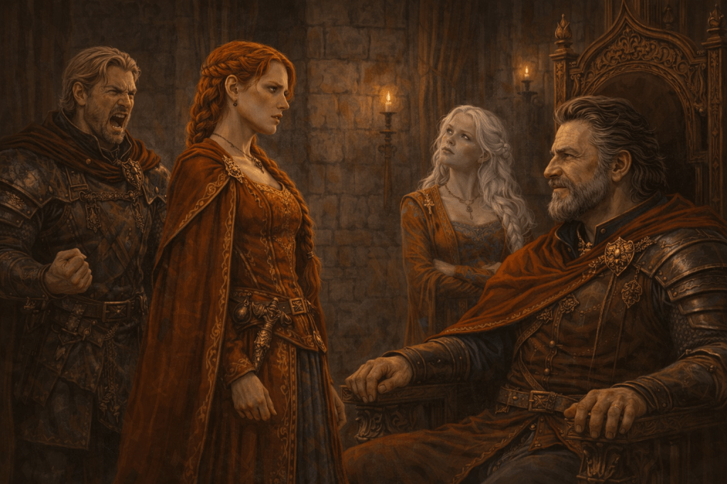 Lady Verna, seated on my right, nudges my side and glares at me, then interrupts, “My brother sees to the needs of his people and has already made this house aware of his village’s vulnerability. My sister in law clearly felt she was safe to travel our realm alone, and you should know better than to eye a woman so far above your station.”
