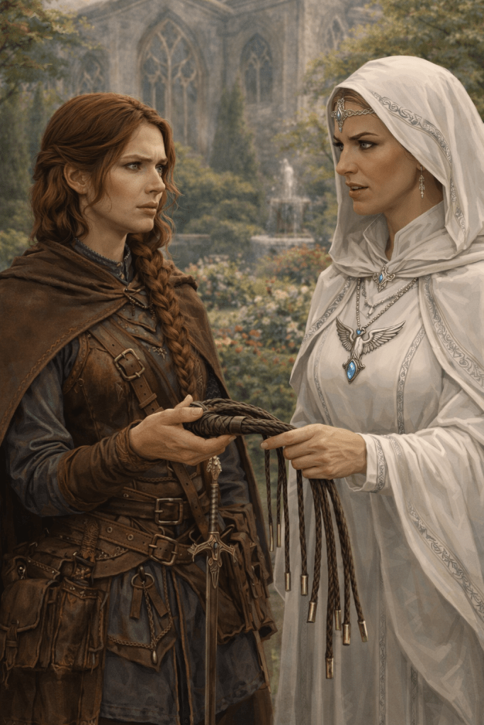 Mother Muriel’s eyes narrow, fixed on mine, seeking any hint of deception, then she speaks again, “I sense that you truly believe the words spilling from your lips, but beware that even Elven magic in its purest form can lure you into corruption as you seek ever more power for yourself. You must guard yourself against such temptation. Drive from yourself the weakness within.” She pulls a small scourge from her belt, a tightly coiled handle with a string of black leather straps. “Drive evil from yourself in your nightly meditations. Remain true to Our Lady, and she will guard your soul in this life and lead you to her in the next.” She presses the scourge into my hand. “Use it well.”
