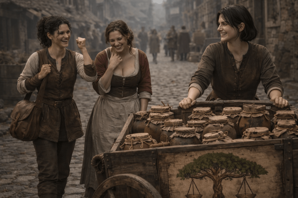 The rest of the market day passes uneventfully, and by the end of the day we’ve cleared twelve and a half crowns. As we pack up, Eveline beams, “Really! In two days, we’ve nearly covered a month’s lodging!”