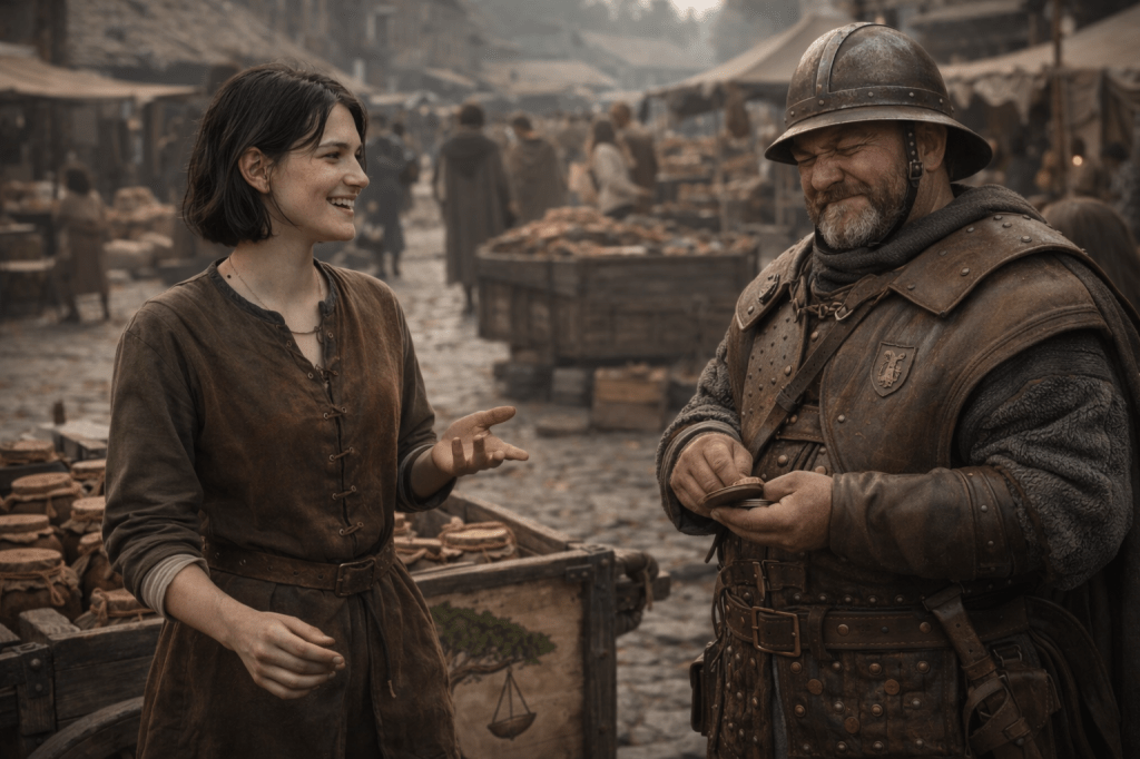 Reaching the market square, there is a sturdy looking sergeant present, different from the man before. “Who are you?” He asks, looking over my cart.