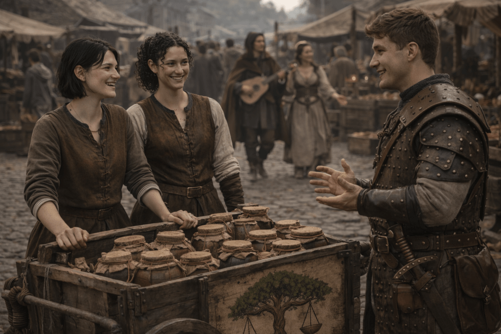 “Not with my sister along,” I grin at Eveline. She smiles at me, but continues serving other patrons while I entertain our nosy watchman, “Oh, have you been to the peddlar’s booth yet? I’m not sure about some of those combs he’s selling.” Borin’s eyes perk up, and he makes a beeline to the peddlar’s booth.