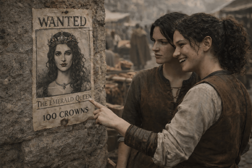 I notice a herald taking up a wanted poster at the edge of the marketplace. Heading over to examine it, it describes a bandit queen whose gang seems to lurk in the nearby hills. “The Emerald Queen…a green eyed seductress…tricks men into revealing secrets…eerily calm. Nearly two dozen in her gang. Bounty, 100 crowns” I mutter to myself as I read it, then return to my booth to tell Eveline.