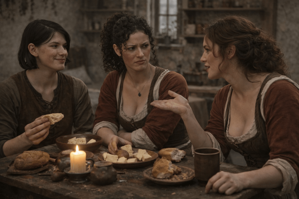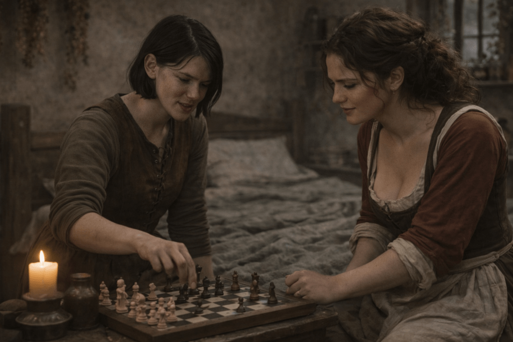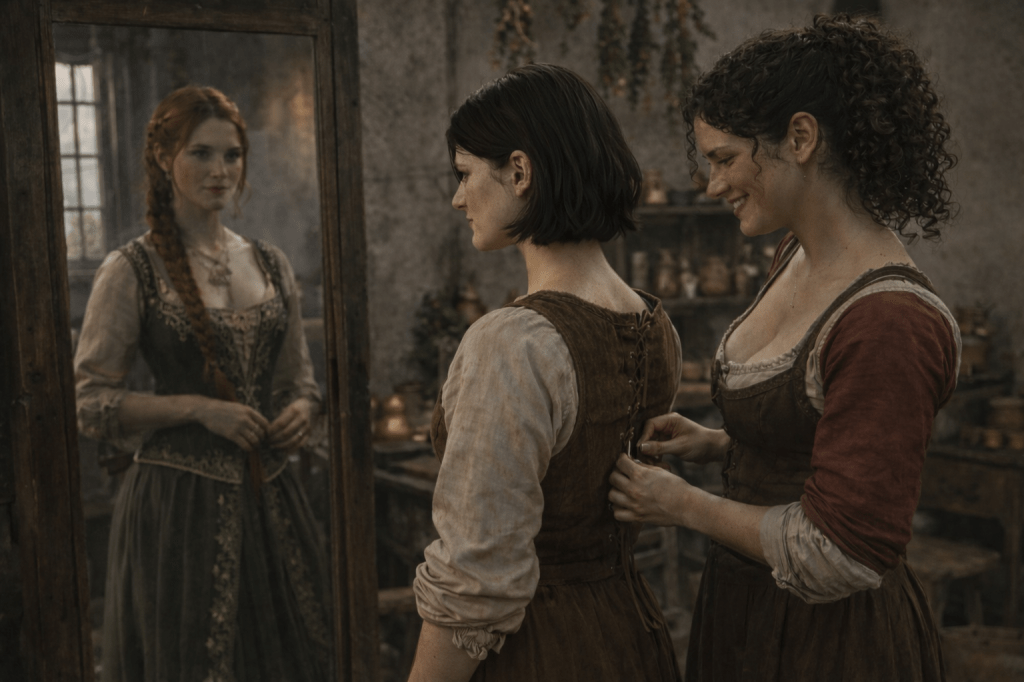 As we dress, Eveline steps behind me and pulls my corset tight as i catch a glimpse of myself in the mirror, and for just a moment, I catch a glimpse of myself, just seventeen years old, here in Oldenstone, Baron Pond’s keep, one of his servants helping me dress for the evening’s festivities. His bride was so beautiful, and the wedding celebration, stretched nearly a month after her birthday. Pond and I slipped away to his library, and quietly played a game of chess while his new bride entertained her vassals. I turn my head, and can scarcely imagine that girl today, her hair long gone, the court finery as well. Eveline slaps my ass, breaking me from my reverie, “Let’s get downstairs! Their’s drinks to pour!”