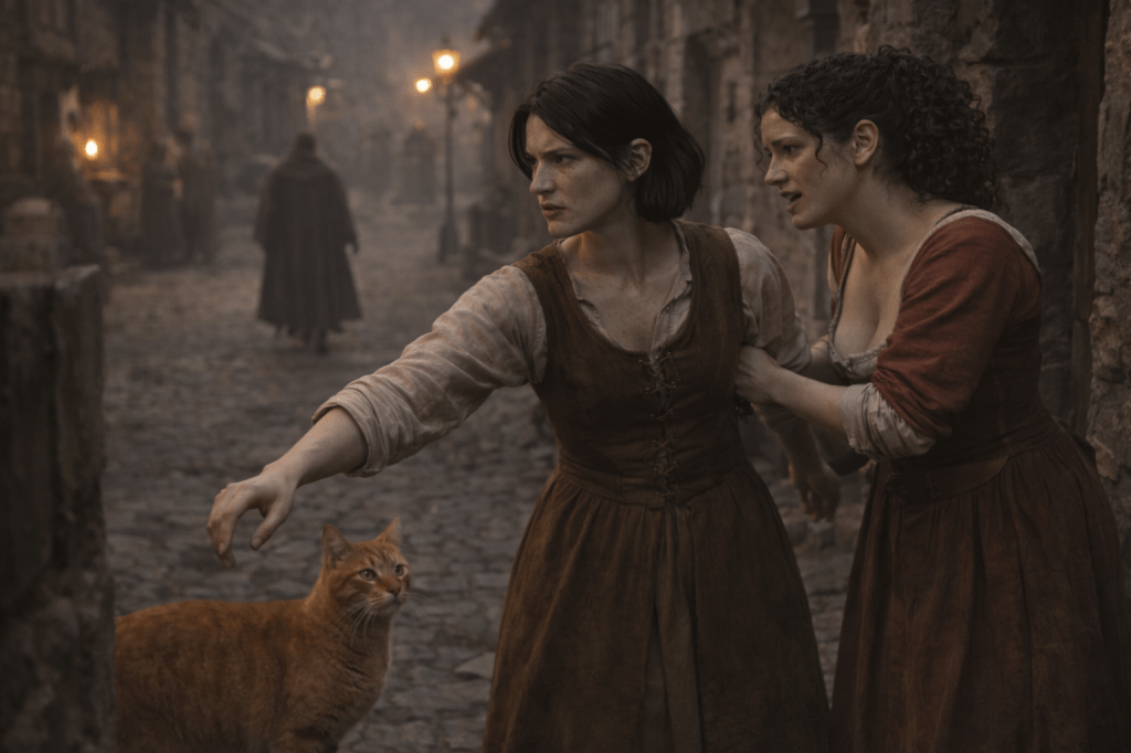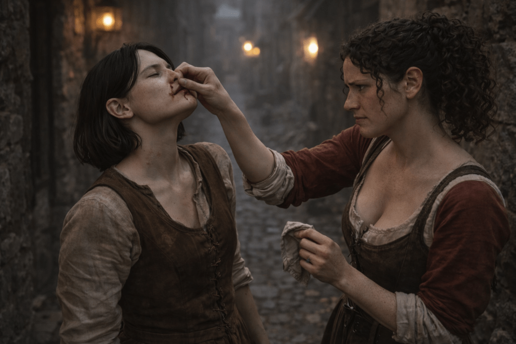 After the market closes, we pack up and begin our slow walk downhill back to Dorak’s alehouse, but as we are going down Spindle Way, that red haired man from the other day spots us, drunk again, and slurring his words. “You! It was you, wasn’t it!” He fumes storming towards me. .