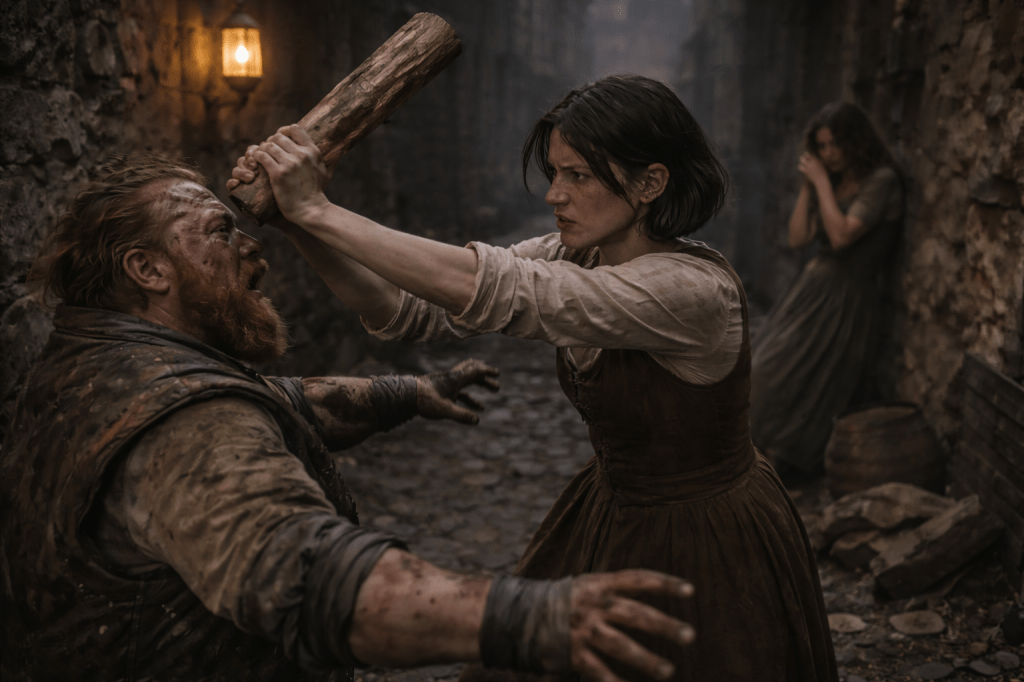 I pull away from her, and grabbing a piece of firewood from nearby pile, try to knock the broomstick from his hand, and cleanly knock it aside. So he takes a swing at me with his meaty fist, and I smack his arm with the chunk of firewood. He cries out in pain. “See how much you like it, you bastard!” I yell at him. He swings his fist again, and I duck back, but miss him with the chunk of firewood.