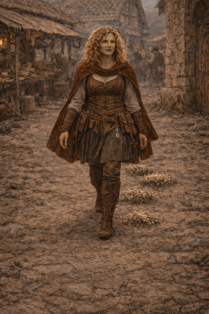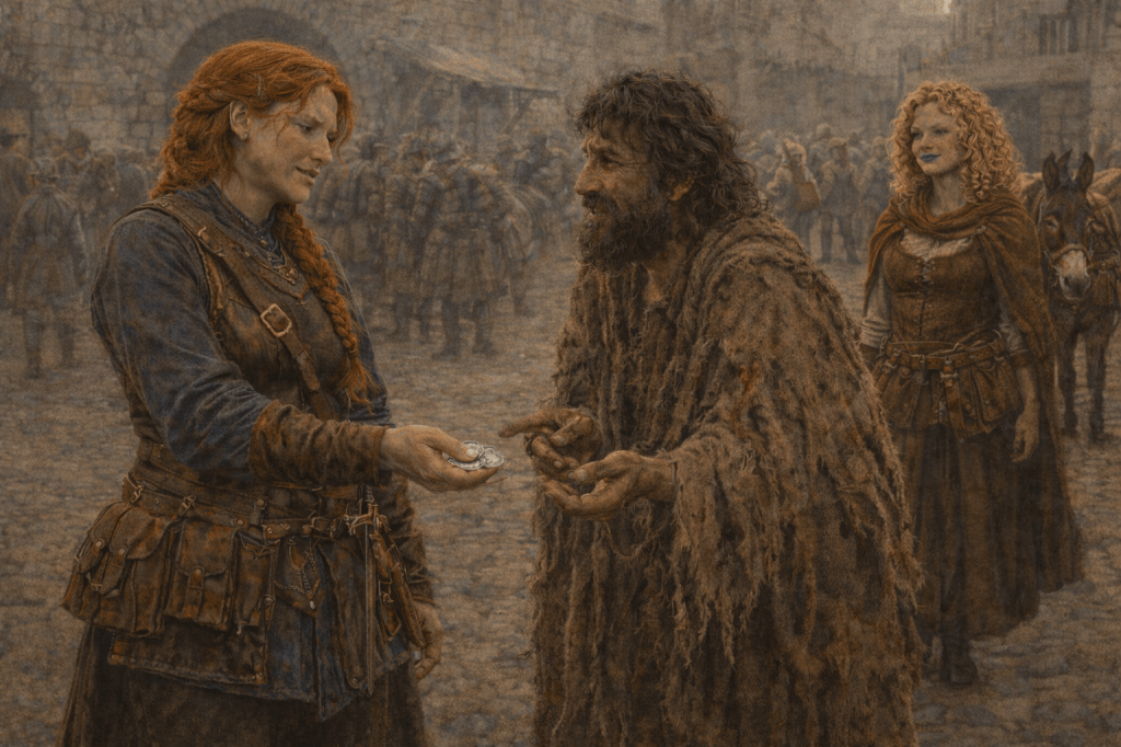Walking through town, the hairy Wildman who often sits outside the gate shakes his empty cup in my direction, “The baron’s girl will have mercy, and I will have bread? And it two days time, she’ll take five orc’s heads. Hare and wild cows will all run away, but five foolish foes will seek her to flay. Then in good time, she will come back home, but cloak she will tear, thorns won’t let that alone.”