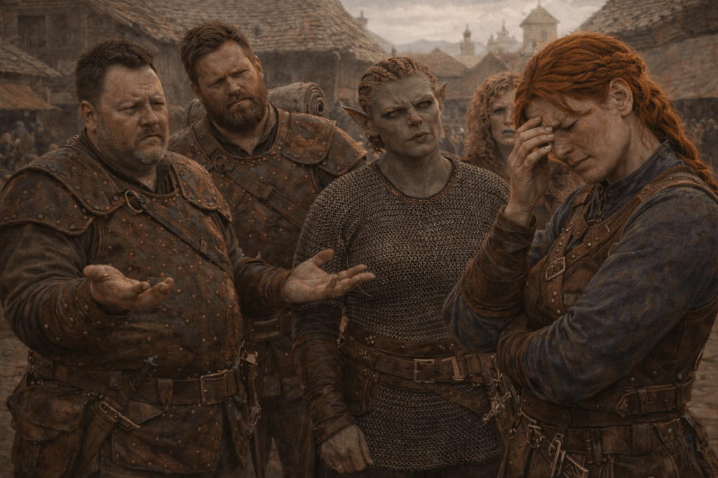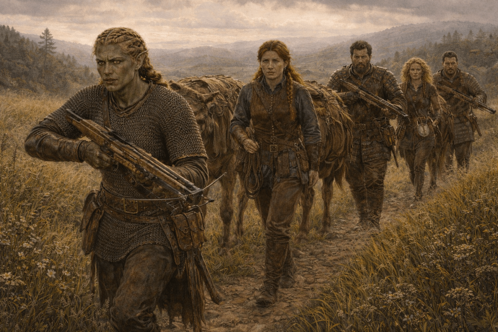 Outside the town gates, I find Karta waiting with a well dressed pot bellied man who looks well past his prime, but he has managed to squeeze into a studded leather jacket and a blade and crossbow hang from his belt. With him is a tall, broad shouldered bear of a man in similar armor, but simpler clothes. Karta grins, “Don’t let their looks fool you, they’re steady men. This is Josias,” she gestures towards the pot bellied man, “and this one, Henrie.” She gestures towards the giant.