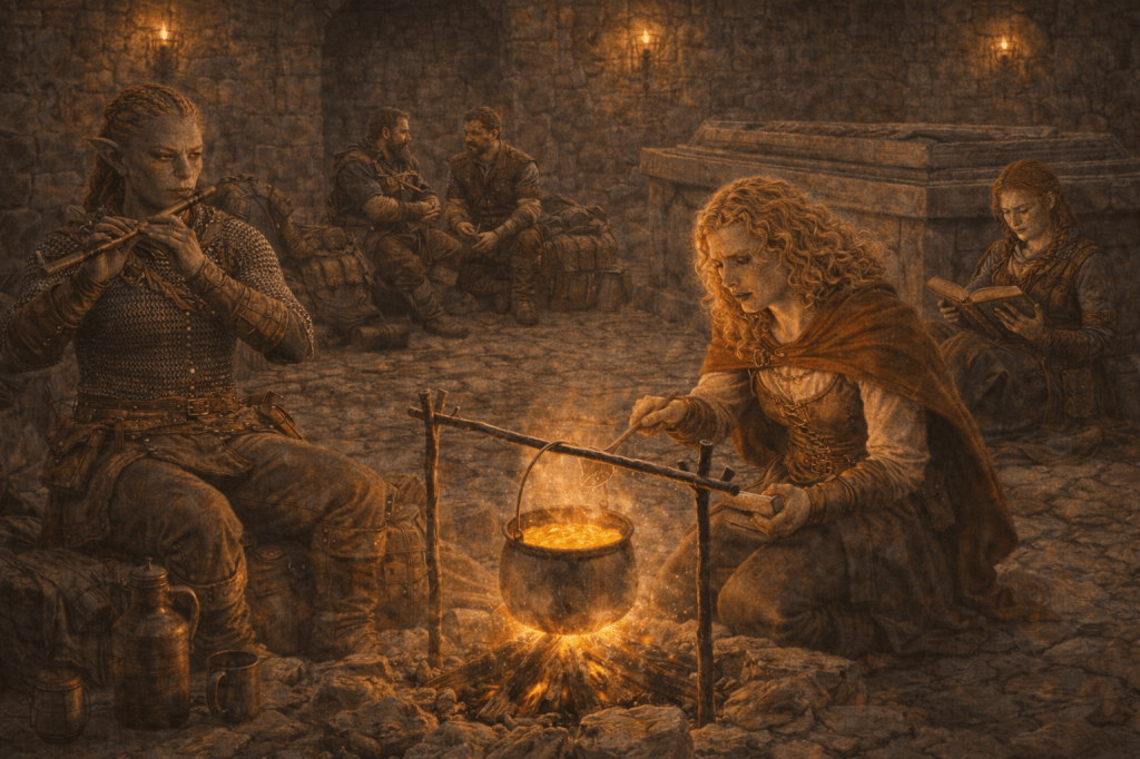 Handing over the mules to the stable hands, Karta and two stable hands help carry our prizes and supplies inside the keep. I dispatch servants to secure my things in my quarters, while the books I bring to the household library, sending a maid to inform Krenal and my father of my return.