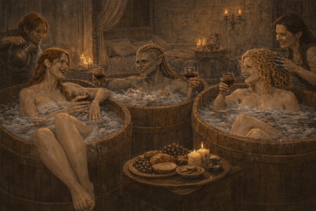My two friends are already there, soaking in their respective tubs while a pair of maids provide wine to enjoy while carefully helping wash the women’s hair. I quickly strip down and climb into my own tub where a third maid brings me a cup and then begins unbraiding, brushing and washing my hair as well.