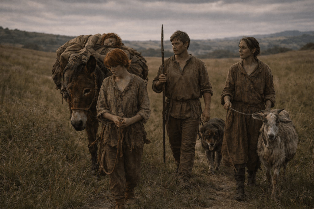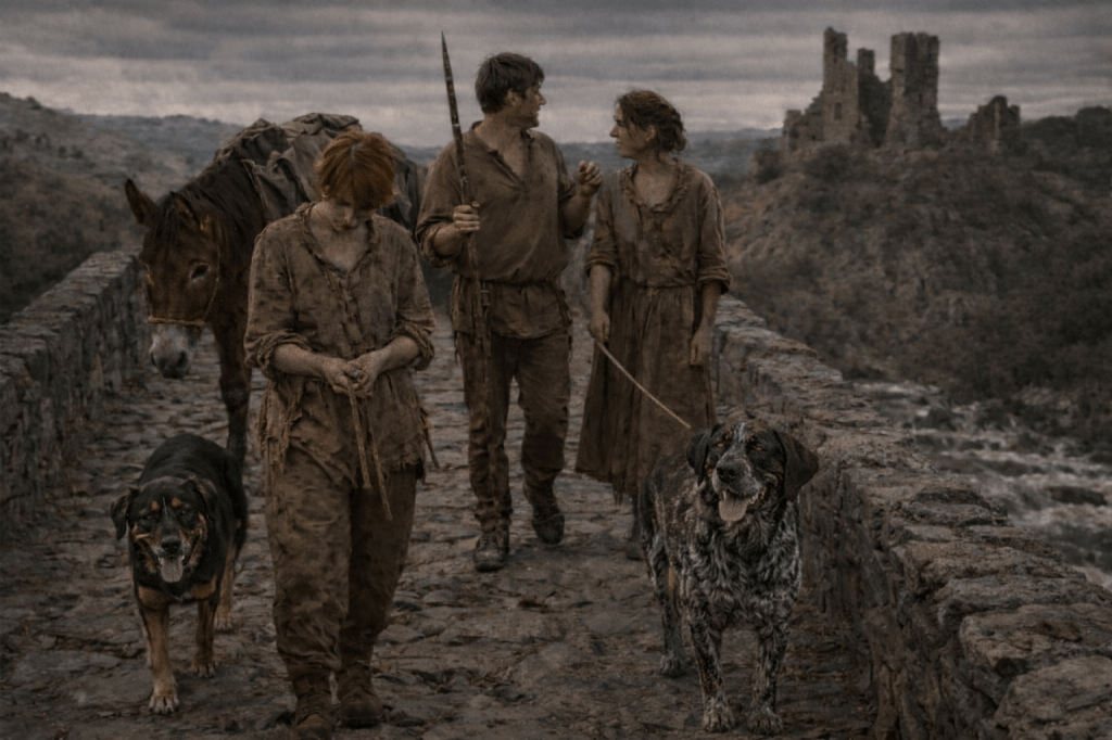 I quickly bind up our bedrolls as Eveline stands and takes a good stretch. She winks at me, and I pretend not to notice. Then I take Hare’s lead and we fall in behind the rest of the group with Eveline walking near the front with Ulf and Reis. I’m in the back with one of Reis’s teenage girls who is leading a dairy goat whose milk was shared among the children in her family. Mycroft travels alongside us, his dog eagerly keeping pace. Princeling has raced ahead and leapt into Eveline’s arms to avoid the exuberant dog.