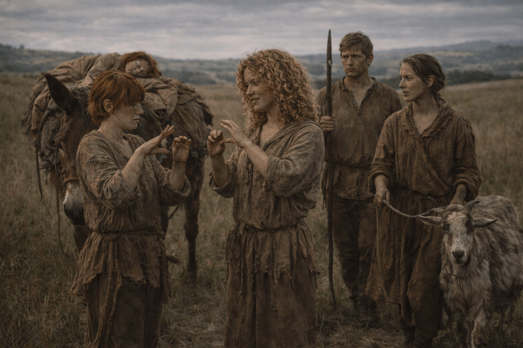 Lucilla and Angwin are up and getting the cooking pot ready for my water. Eveline is sorting out what food for us to contribute to the pot. Flora is milking Petunia. Sena and Nelly are nowhere to be seen. The boys wait, eagerly, for breakfast, and begging for some more bread or cheese from last night. Fresa warns them all to be patient. Rhena is mending a tear in her dress. Reis’s twin boys, who had wandered off, suddenly race into the camp. “We’ve been hired to gather some firewood. We’ll be back soon…don’t leave without us!” they stammer, then run off.