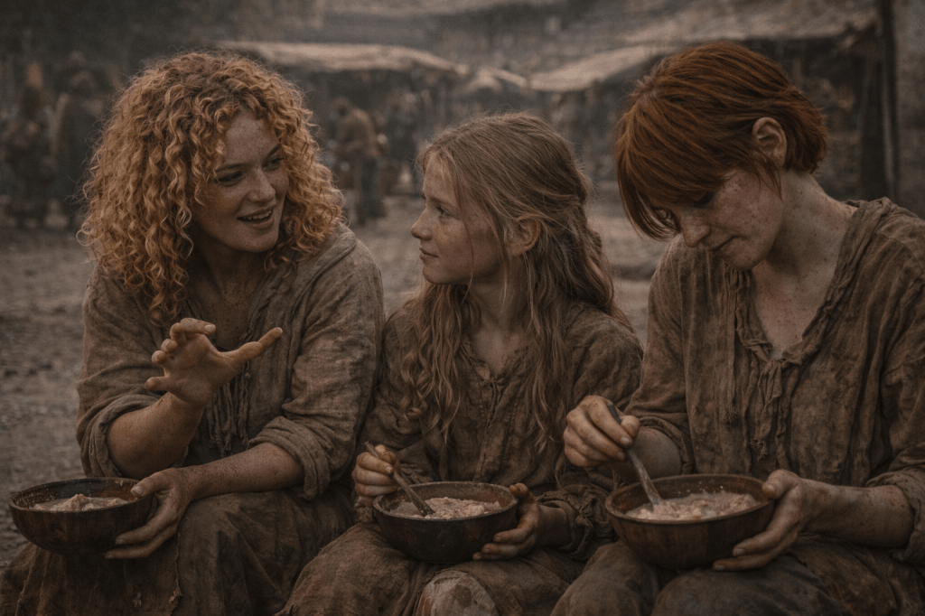 Her little sister with the firewood warns her, “Let’s see what the blonde woman has. They traded that necklace for lots of food, but you can’t add carrots before beans and oats have softened.”