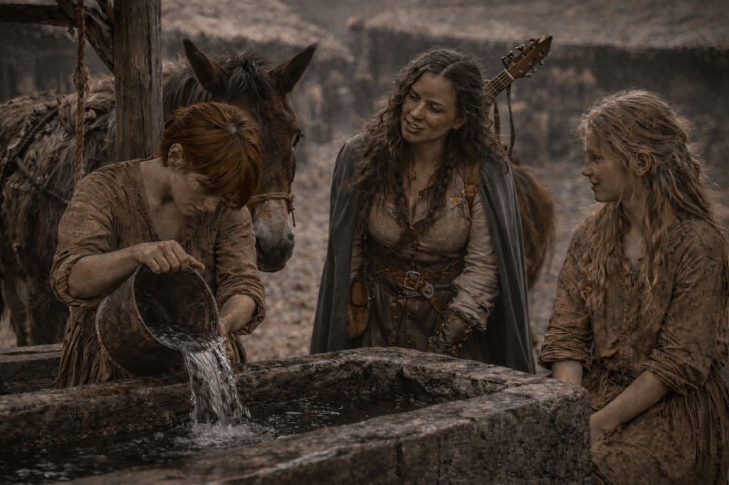 I quickly fill the bucket and start adding water to the pot, then on my return trip to the well, take Hare with me to drink. Then I bring him back behind me and set down the second bucket full of water near the goat that one of Madge’s grand daughters is milking. Mycroft’s dog rushes over for a drink.