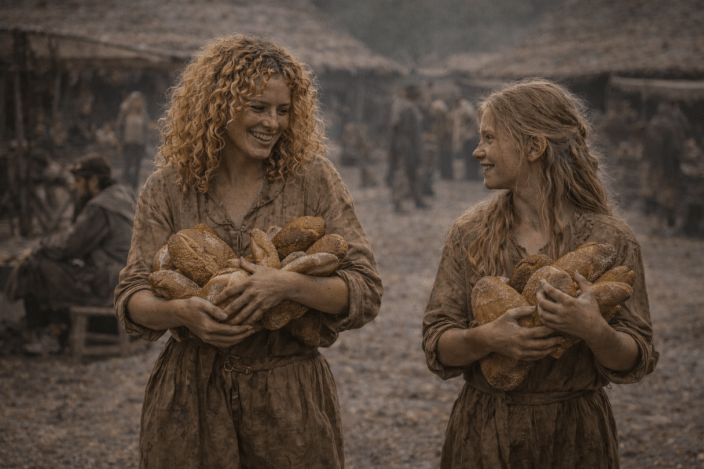 She puts another silver coin down next to mine, “Two of the sweet honeyed loaves for her as well. They’ve had a hard time of it I suspect.”