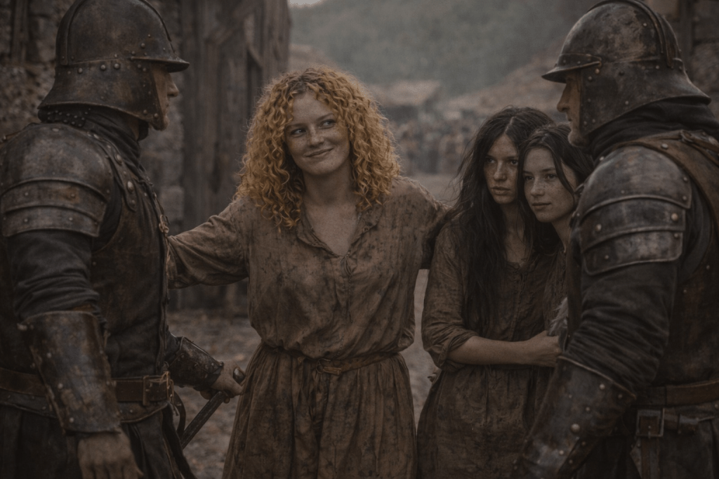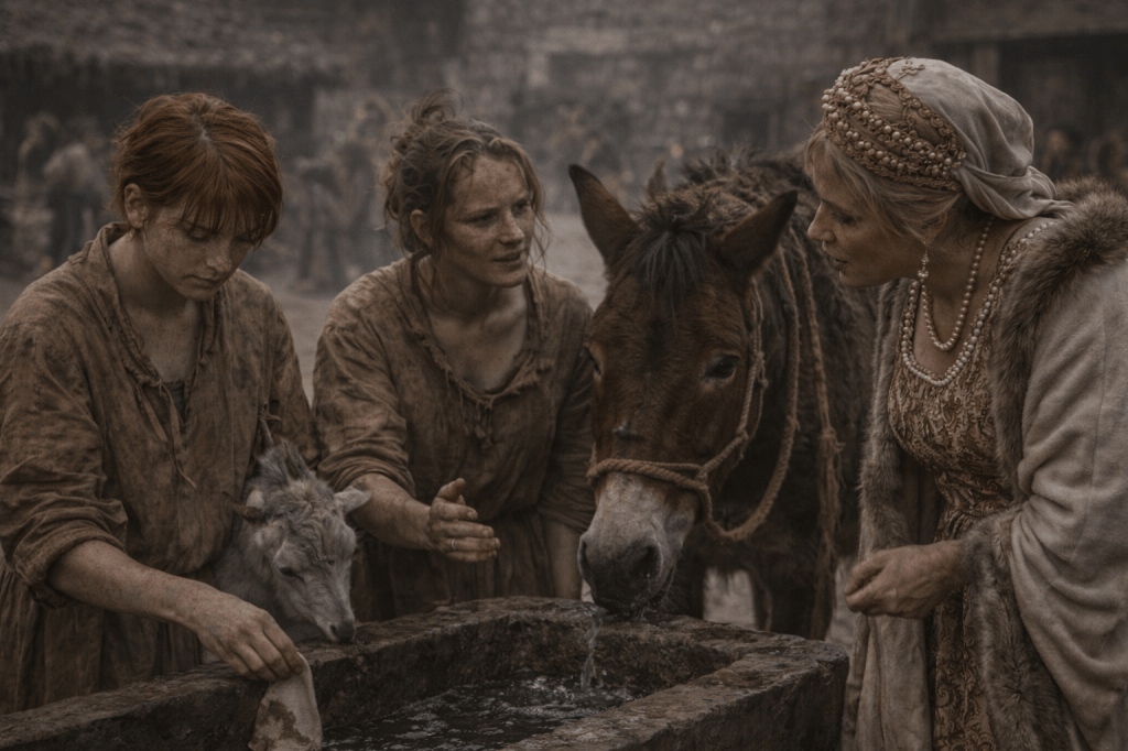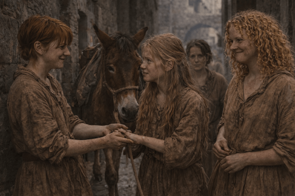Suddenly, I remember something,”Wait!” I say, turning to face the girls once more. I dig through the sacks of peas and beans, fishing out seven full pouches of coin and passing them to Eveline to put in her satchel. “There’s food enough on Hare for a few days while you all get settled. Keep Hare’s blanket on him here in town, lest the brand be recognized. I assure, that he is my mule, but…I am being sought, and he is the last thing I have that would give me away.” Looking to Lucilla, “Now he’s part of your sister Sena’s dowry.” To both, “if anyone asks, I can’t afford to take him on the barge south to Kiddimir. A few of your parents know that’s not true, but it should satisfy the rest. There is coin in the sack of beans. Only gold though. Until your families get set up, you might use one a day to buy provisions. You can claim to have found a coin in the street. Use the story with a different vendor each day, rotate, swap out with your siblings or something….so they are less likely to wonder how your families have coin. The rest…everything else on the mule. Do with as you see fit. Just see that Hare is well cared for. He’s a good beast.”