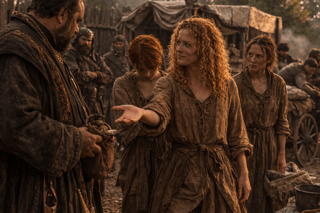 Eventually, the boys return each showing off a silver tenpiece they earned and handing it over to their father. He thanks them joyfully, rubbing their heads.I give Flora a quizzical look, and she pats her apron, and I suddenly realize, she didn’t give the crowns to the camp yet. I chuckle and shake my head.