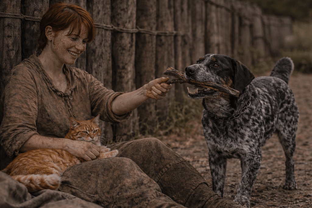 As we head out the village gates, I see several men down by the river skinning and gutting the morning’s catch. I recoil slightly, but Princeling leaps down after them. I grunt and point. The girl with the goat yells up, “Mom! The cat’s running away!” Eveline looks while Mycroft’s dog starts after him.