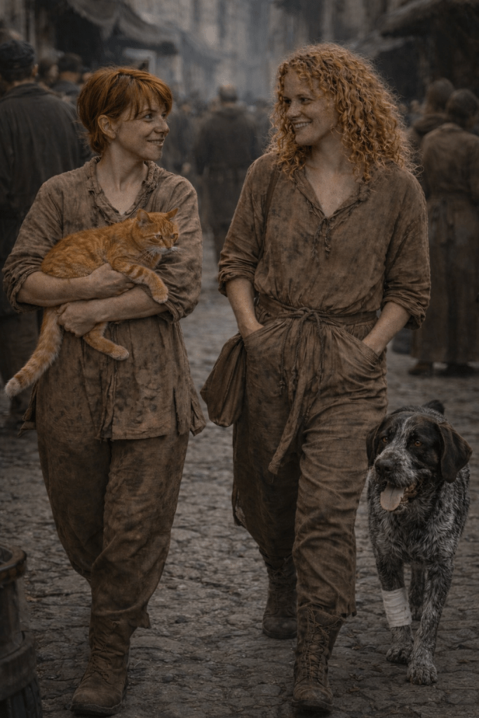 I glance around, then reply, “No, but the cat might get yours if you aren’t careful.” I pull the girls into a nearby alley and whisper to Lucilla, “Keep the pendant, it’s yours. I’ve had it since Separation. It was a gift from my father when I departed for my apprenticeship.” Then I turn to Flora, “And keep that bracelet. It may not be worth much, but it’s more than 3000 years old. I found it beyond the Lone Fields inside an ancient elven library called Guldall.” Then I tell both girls, “Keep these things hidden from your family until you can come up with some way to explain having them. And don’t tell them about this conversation.” I”m glad to know you both, and I’ll always count you as friends.” I kiss them each on the forehead, then lowering my gaze, Eveline and I head back into the street, leaving the girls to go return to their families.